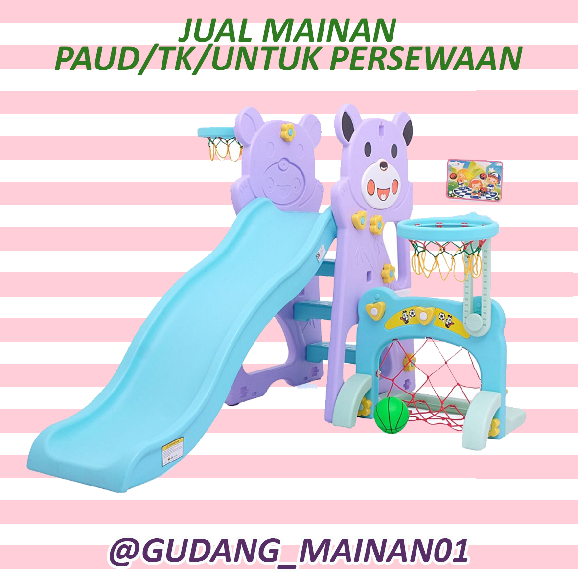 Bus Slide Mainan Perosotan yang dilengkapi dengan ring basket. Maksimum berat 50 kg . Dimensi : 165 x 67 x 92 cm . Untuk anak usia 1,5 - 6 Tahun keatas (maks 20 kg). Melayani pengiriman seluruh Indonesia.